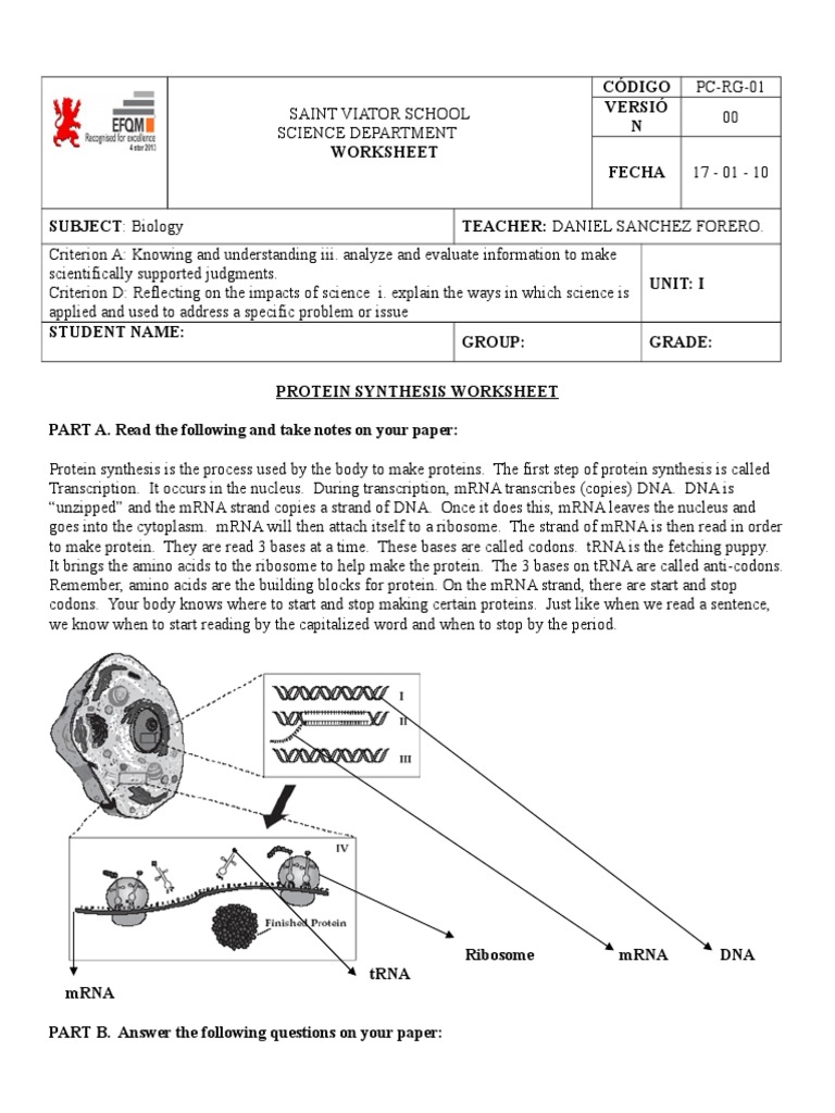 Protein synthesis worksheet part a. Dna is unzipped and the mrna strand copies a strand of dna. Fill in the flow chart below using the following words. The first step of protein synthesis is called transcription.